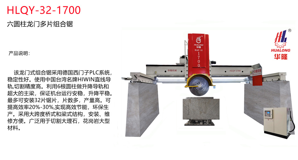6 Pillars Multi-blade Stone Cutting Machine HLQY-32-1700  is a new developed heavy-duty stone machinery. Equiped with 6 pillars for spindle sliding and 32 pieces of circle blades, it's suitable for cutting granite blocks into slabs high efficiently.